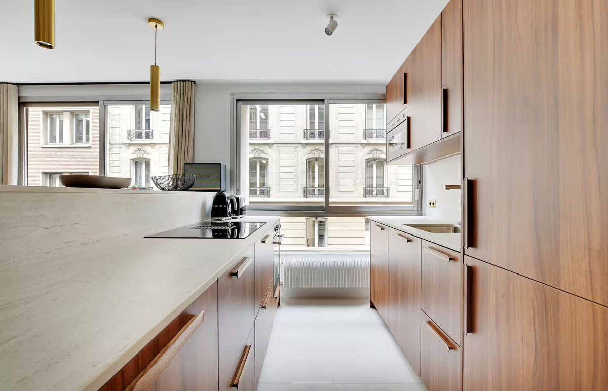Un îlot central complète cette cuisine conçue pour être fonctionnelle et confortable.